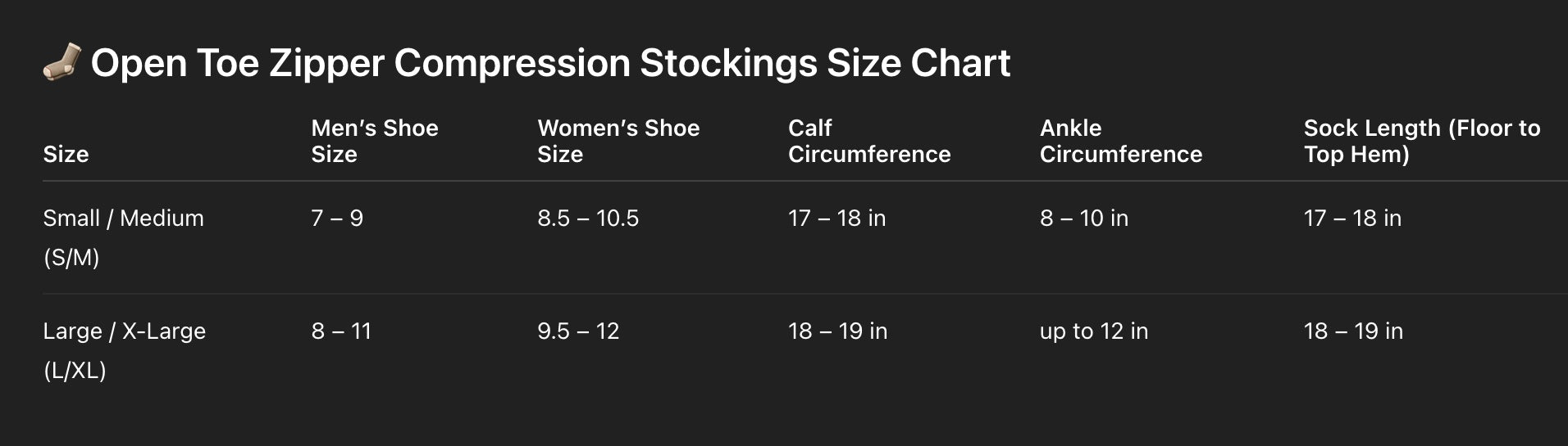 Experience targeted relief and all-day comfort with our Open Toe Copper Infused Zipper Compression Stockings. Designed with a convenient side zipper, these stockings are easy to put on and remove, making them perfect for those who struggle with traditional compression wear. The open toe design allows for breathability and versatility, ensuring a comfortable fit for both men and women. With graduated compression, they improve circulation, reduce swelling, and support tired legs—ideal for travel, work, or recovery.